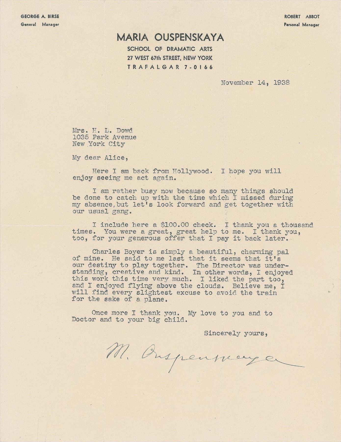 Oscar-nominated, Russian-born actress (1876–1949) best remembered for her portrayal of Maleva, the old fortune teller in the 1941 horror classic The Wolf Man. TLS signed “M. Ouspenskaya,” one page, 8.5 x 11, personal letterhead, November 14, 1938. Letter to Mrs. H. L. Dowd, in part: "Here I am back from Hollywood. I hope you will enjoy seeing me again…let's look forward and get together with our usual gang…Charles Boyer is simply a beautiful, charming pal of mine. He said to me last that it seems that it's our destiny to play together. The Director was understanding, creative and kind. In other words, I enjoyed this work very much. I liked the part too, and I enjoyed flying above the clouds. Believe me, I will find every slightest excuse to avoid the train for the sake of a plane." In fine condition. Accompanied by an unsigned modern glossy photo.