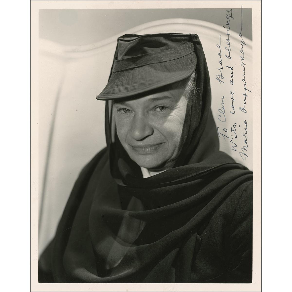 Oscar-nominated, Russian-born actress (1887–1949) best remembered for her portrayal of Maleva, the old fortune teller in the 1941 horror classic, The Wolf Man. Ouspenskaya died from a stroke several days after receiving severe burns in a house fire, which she had caused by falling asleep while smoking a cigarette. Striking vintage glossy 8 x 10 photo, signed and inscribed in fountain pen “To Clem Brace, with love and blessings, Maria Ouspenskaya.” In fine condition, with a few trivial surface marks.