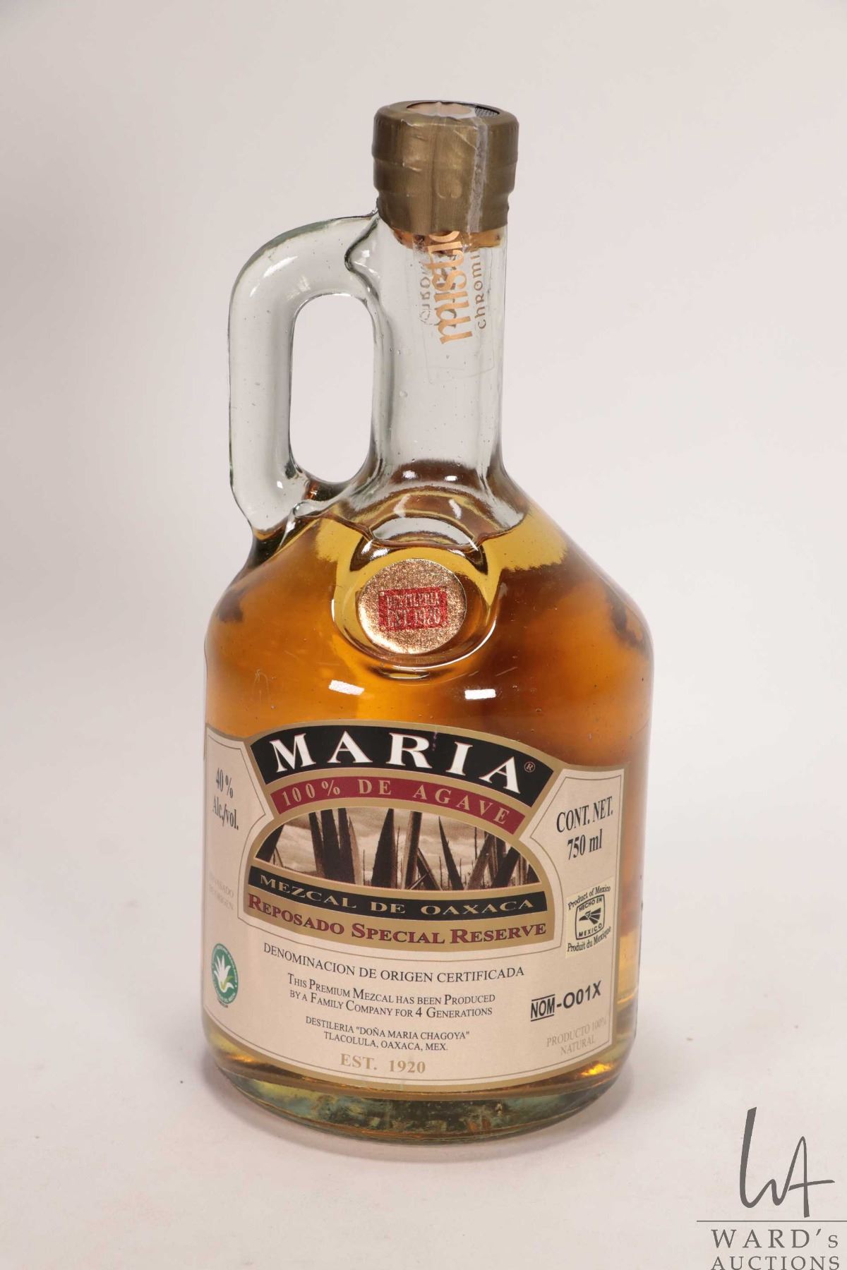 Maria/ Reposado Special Reserve/ Mezcal/ 750ml/ 40% ABV, Lot No. RC-004, Bottle No. 359 Note: Alcohol cannot be insured by any courier in Canada. Local pick up is recommended. Canadian bidders only.