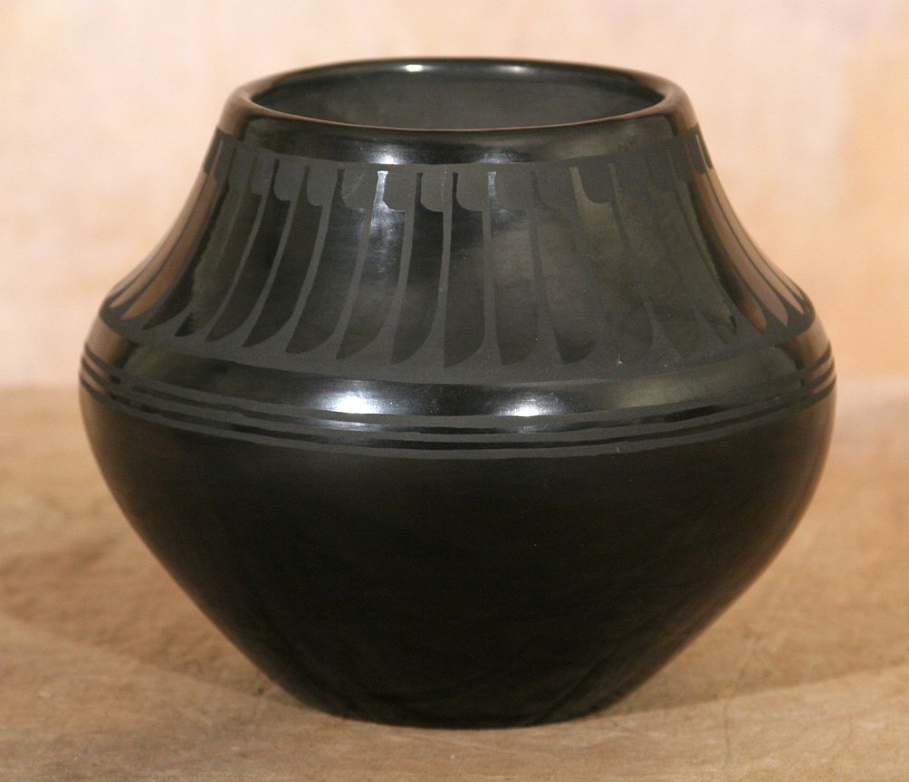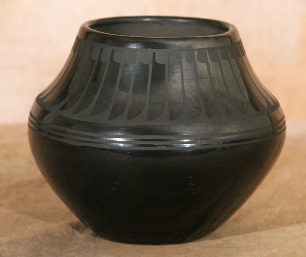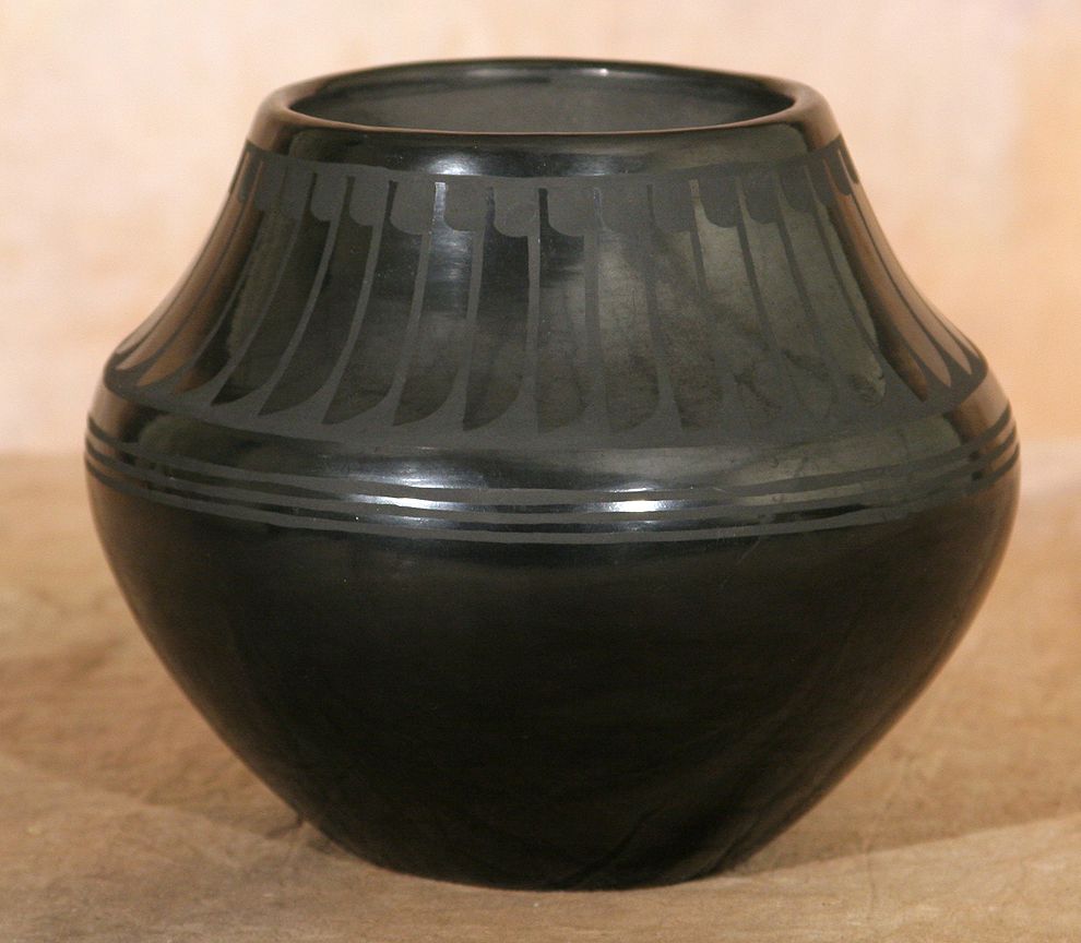 Maria & Santana Jar. 5 ¾" x 6 ½" blackware jar with feather motif. Signature inscribed on the bottom. (est. $3,500-4,500). CONDITION REPORTS: www.auctioninsantafe.com/docs/cr2012.pdf