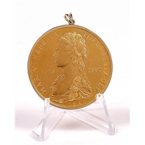 <Our item number 136837><B>Maria Theresa of Austria 10 Ducat Coin With Bezel.</B> 1.1 oz pure gold (34.5000 grams) plus bezel. Struck in 1957. Front with bust and legend "Maria Theresia Imperatrix Ger.", with dates "1717" and "1780" on either side; strike date is at bottom. Back has an "X" in the center of a 6-pointed cross with lilies in angles. The legend says "Pro Prosperitate Mundi." <BR>Estimated Value $900 - 1,000. <BR><BR>Our item number 136837<BR><IMAGES><P ALIGN="CENTER"><IMG SRC="http://www.goldbergcoins.net/liveauction/49jpegs/136837.jpg"> </P></IMAGES>