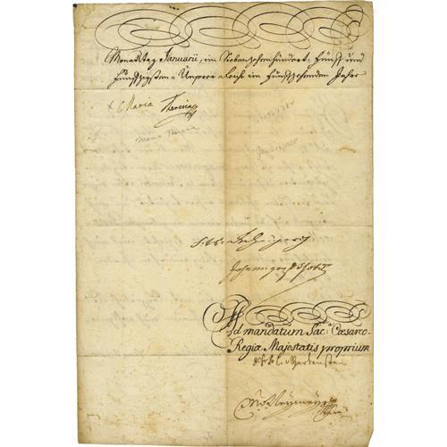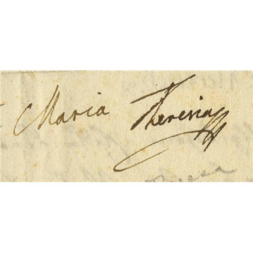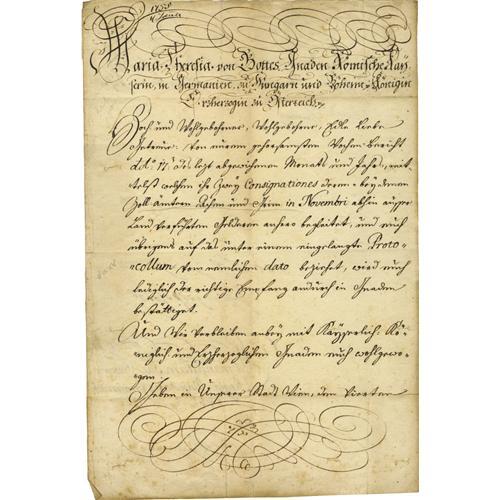 <B>Maria Theresa of Austria Document Signed</B></I> "<I>Maria Theresa</B></I>" as empress, two pages in German, 9" x 13.5", January 12, 1755, n.p. Maria Theresa ( 1717 - 1780) reigned as Archduchess of Austria and Queen of Hungary and Bohemia. She was the eldest daughter of Emperor Charles VI, who promulgated the Pragmatic Sanction to allow her to succeed to the Hapsburg monarchy. Opposition to her acceding to the throne led to the War of the Austrian Succession in 1740. After Emperor Charles VII, who claimed the throne, died in 1745, Maria Theresa obtained the imperial crown for her husband, Francis I. Though she was technically empress consort, Maria Theresa was the de facto ruler of the nation, and she began styling herself Holy Roman Empress in 1745. In very fine condition.<BR><BR><b>Shipping:</b> Flat Material, Small (<a target="_blank" href="http://www.heritageauctions.com/common/shipping.php">view shipping information</a>)