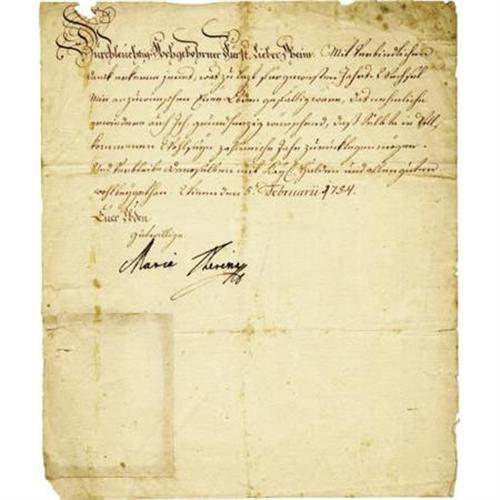 <B>Maria Theresa of Austria Manuscript Document Signed</B></I> "<I>Maria Theresa</B></I>" as empress, one page in German, 8.75" x 10.25", n.p. February 5, 1754. Maria Theresa (1717-1780) reigned as Archduchess of Austria and Queen of Hungary and Bohemia. She was the eldest daughter of Emperor Charles VI, who promulgated the Pragmatic Sanction to allow her to succeed to the Hapsburg monarchy. Opposition to her acceding to the throne led to the War of the Austrian Succession in 1740. After Emperor Charles VII, who claimed the throne, died in 1745, Maria Theresa obtained the imperial crown for her husband, Francis I. Though she was technically empress consort, Maria Theresa was the de facto ruler of the nation, and she began styling herself Holy Roman Empress in 1745. In very good condition with edge roughness, folds, and one area of paper replacement, not affecting the bold signature.<BR><BR><BR><b>Shipping:</b> Flat Material, Small (<a target="_blank" href="http://www.heritageauctions.com/common/shipping.php">view shipping information</a>)