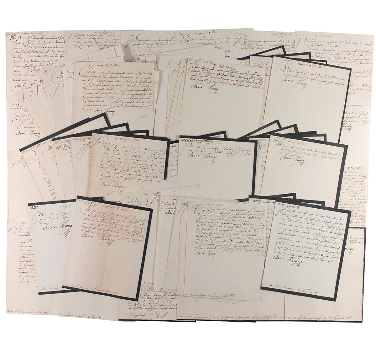 Empress of Austria (1717–1780) and mother of Marie Antoinette. Large collection of approximately 100 official letters to Ludwig Count Zinzendorf and his brother Charles, all in German, some single-page and some multi-page. The letters, all LSs, span many years. One letter, dated December 16, 1766, reads, in part: (translated): “I have learned that the clerks of my departments have been instructed to be present at the chancellery on Sundays and non-exempted holidays, in such a way that they are frequently prevented from attending the Holy Mass and paying their devotion. As it is my policy that civil servants must by no means be detained from fulfilling their religious duties, I hereby issue the directive that from now on a rule be introduced in all my departments both in Vienna and in the country, stating that on Sundays and non-exempted holidays only one or two clerks must be present, on a rotating basis, and only after first having properly been to Holy Mass, so as that they may attend to any urgent matters that may present themselves.” In overall fine condition.