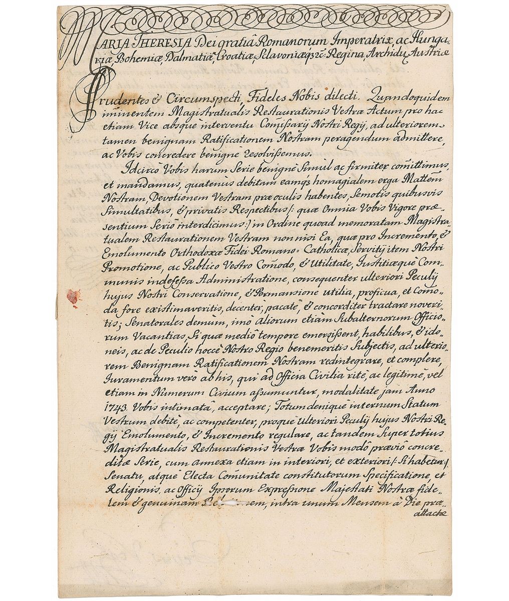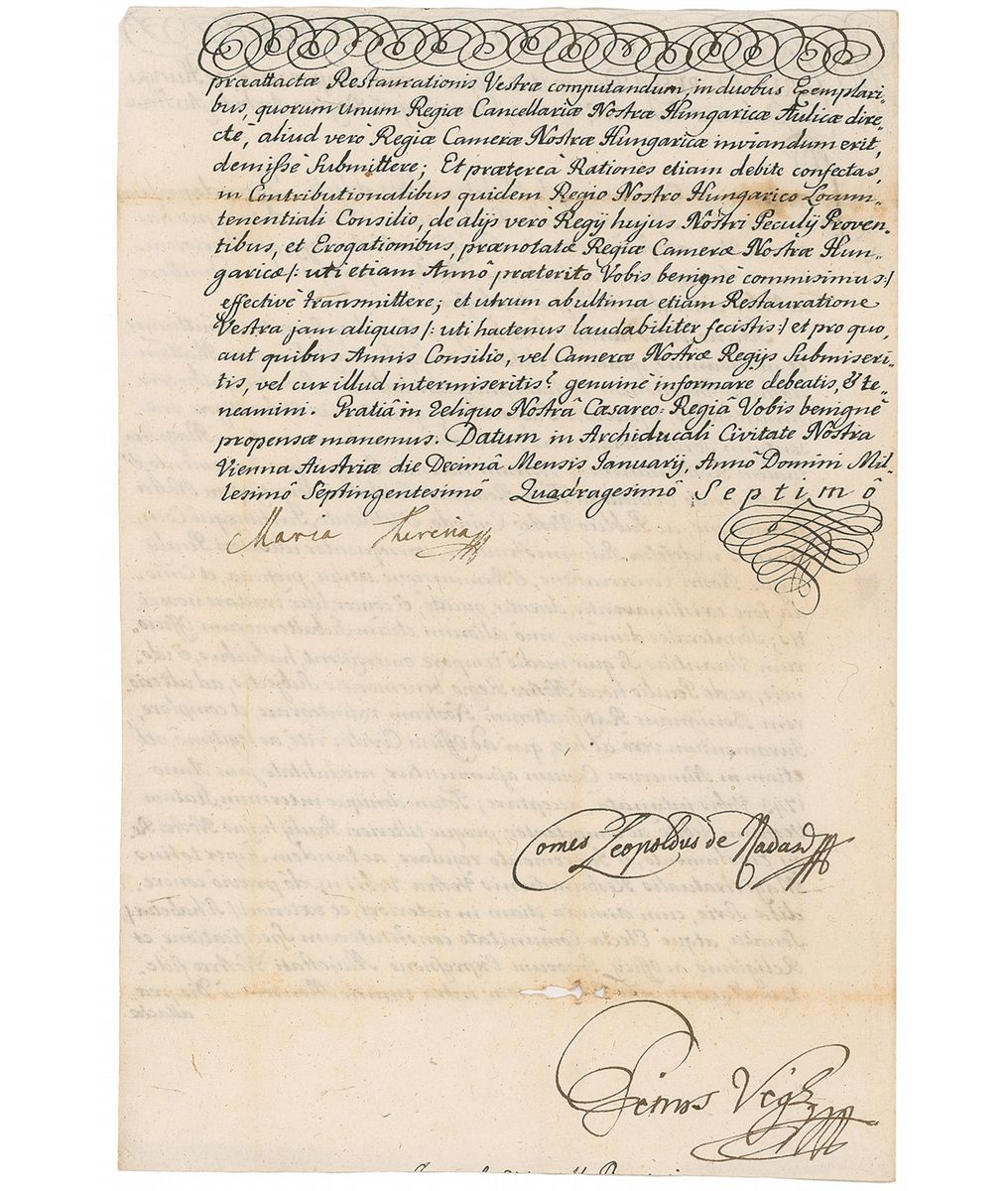 Holy Roman Empress and Queen of Bohemia (1717–1780) who was the mother of Marie Antoinette. LS in Latin, one page both sides, 8.5 x 13, January 10, 1747. Untranslated letter to the city of Rudna concerning administrative matters. Neatly signed at the conclusion by Maria Theresa and countersigned by Count Leopold Nadasdy. The official white paper seal remains intact and affixed to the reverse of the second integral page. Intersecting folds, a few trivial stains, and slight paper loss affecting just one word of the last line on the first page, otherwise fine condition.