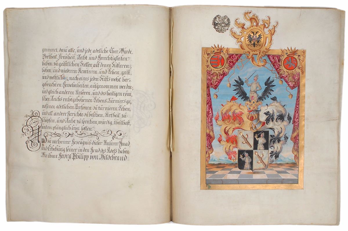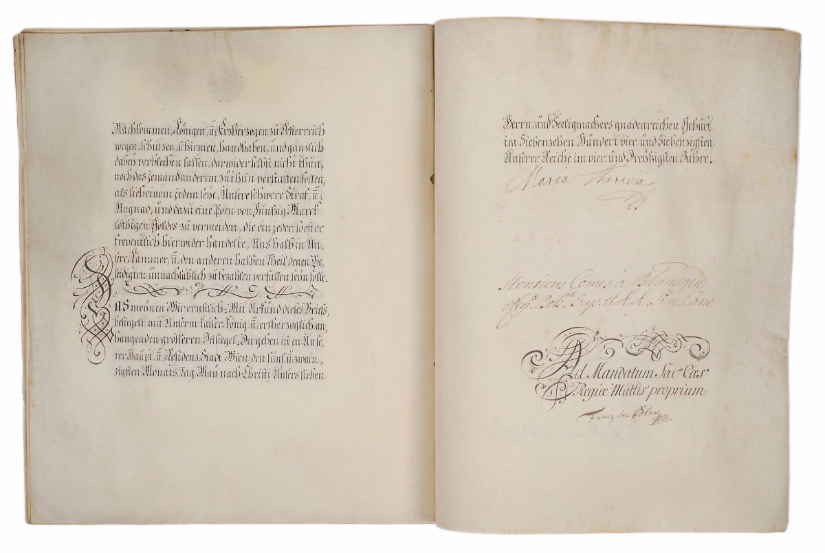 Holy Roman Empress and Queen of Bohemia (1717–1780) who was the mother of Marie Antoinette. Manuscript DS in German, fifteen pages, 12 x 14.25, May 25, 1774. Gorgeous patent of nobility for Georg Philipp von Hildebrand, captain lieutenant of an infantry regiment, featuring a colorful full-page, hand-painted depiction of his coat of arms. Signed at the conclusion by Maria Theresa and countersigned by Heinrich Count Blumegen and privy councilor Franz Anton von Blanc. In fine condition, with mild foxing and expected document wear. An especially appealing document given its stunning illustration.