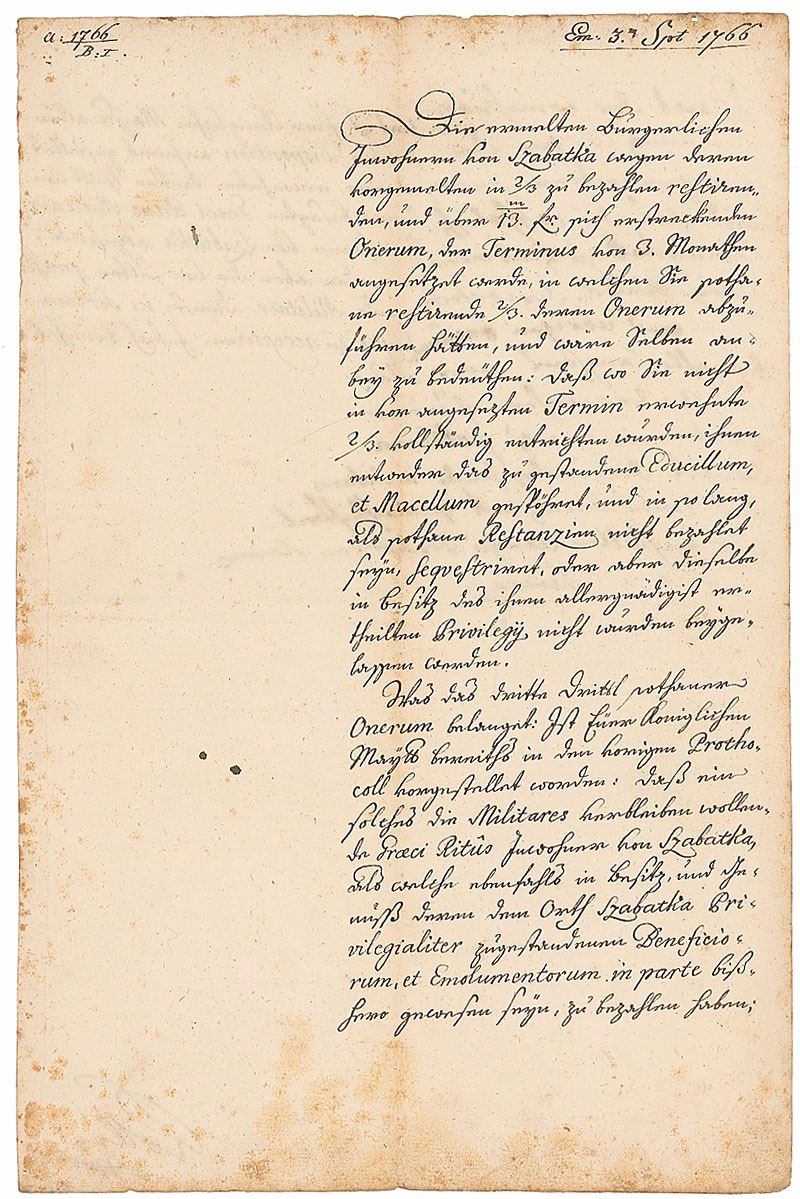 Holy Roman Empress and Queen of Bohemia (1717–1780) who was the mother of Marie Antoinette. Untranslated handwritten endorsement, in German, signed “Maria Theresa,” on a manuscript document, also in German, one page, both sides, 8.5 x 13, dated September 3, 1766. She pens a 13-line endorsement along the left side of the reverse. Central horizontal and vertical folds, and scattered toning and foxing to edges of both sides, otherwise fine condition.