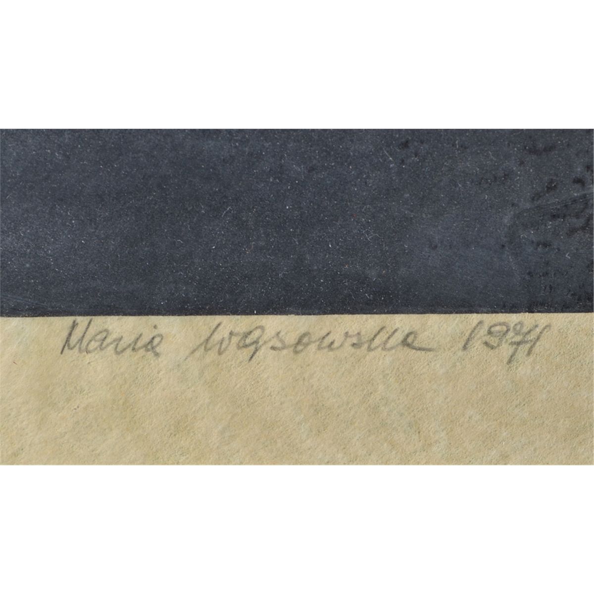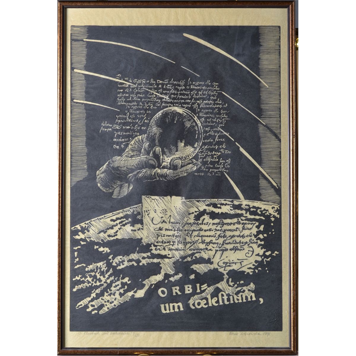 Titled "Orbium Coelestium," depicting a earth with hands holding a ball and writing. Signed in LR and dated 1971, titled in LL in pencil. 26.75" H x 18.5" W, sight, 31.25" H x 21.25" W, framed. Private collection of the late Benedict Markowski, a long time archivist of the Detroit Public Library.