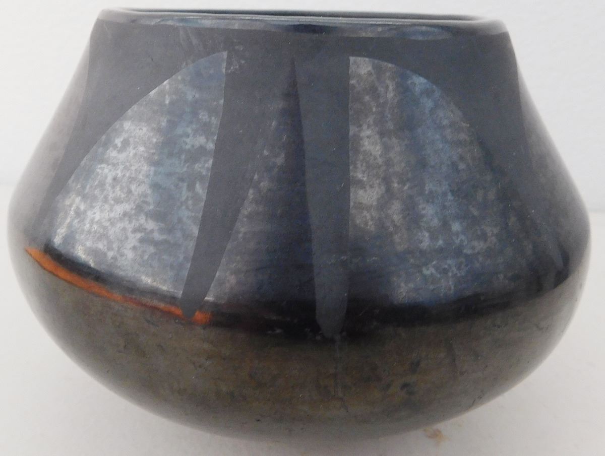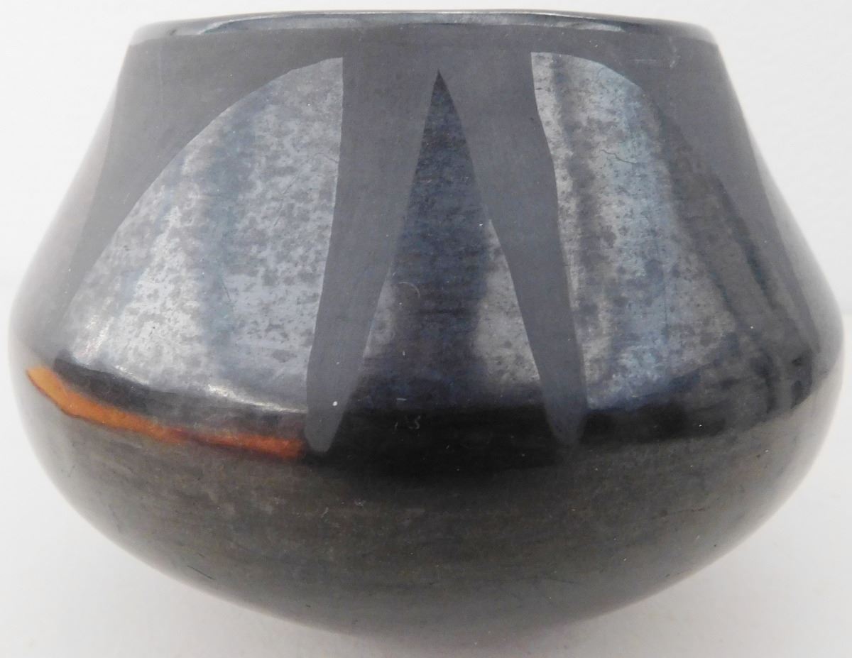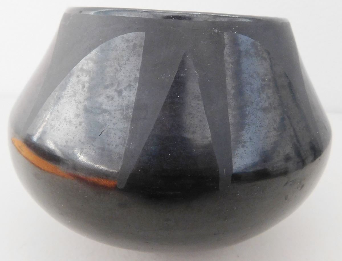 Maria and Julian Olla, circa 1948. Made of clay and paint, this item measures 6 x 4 1/2 inches. This rare pot is signed by Maria and Julian on the bottom. From San Ildefonso, New Mexico. Condition: Good, minor scuffs, see images. Shipping: $40.00 w/insurance.