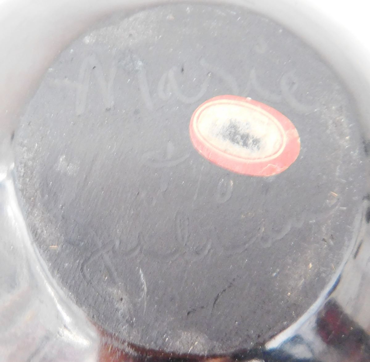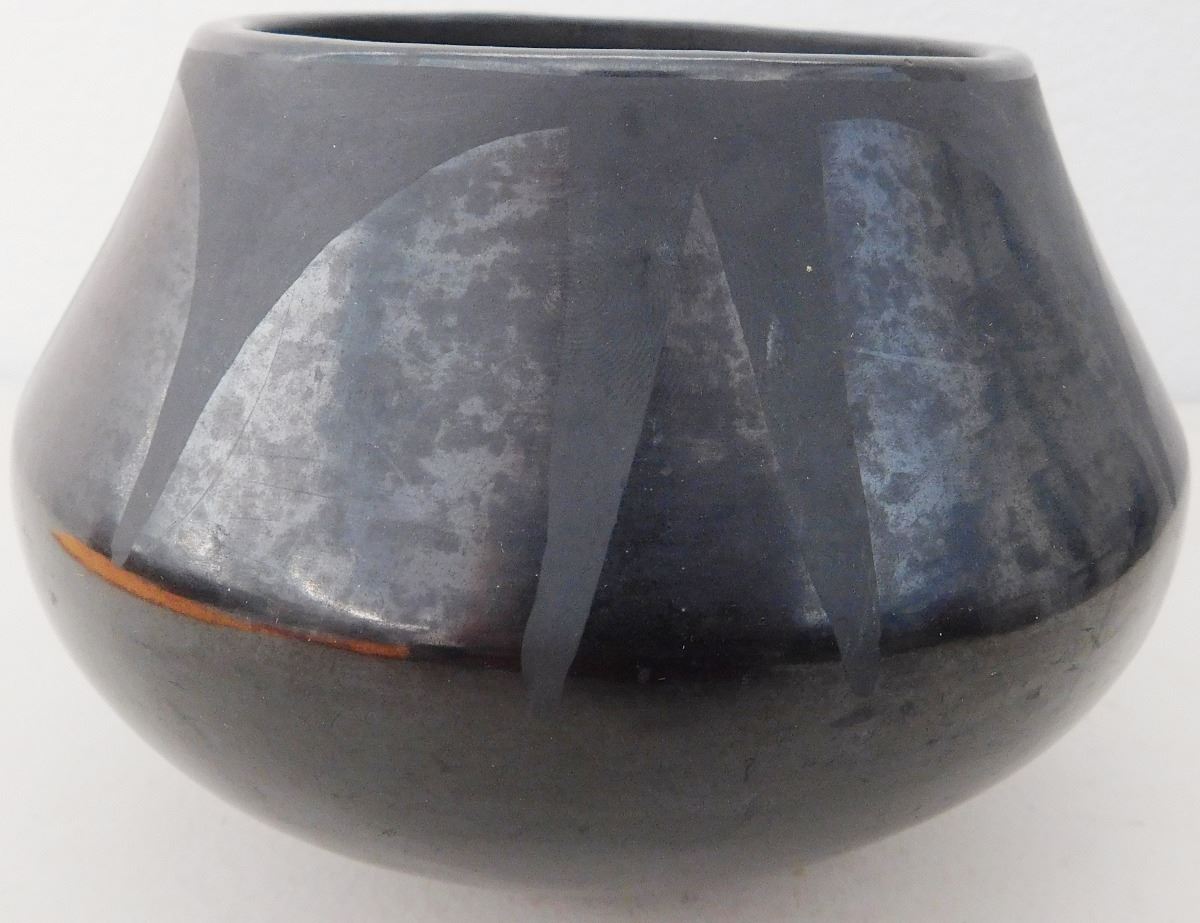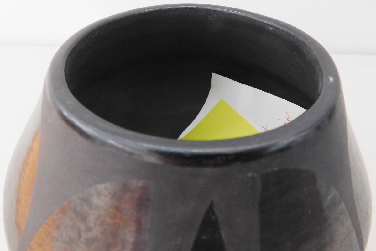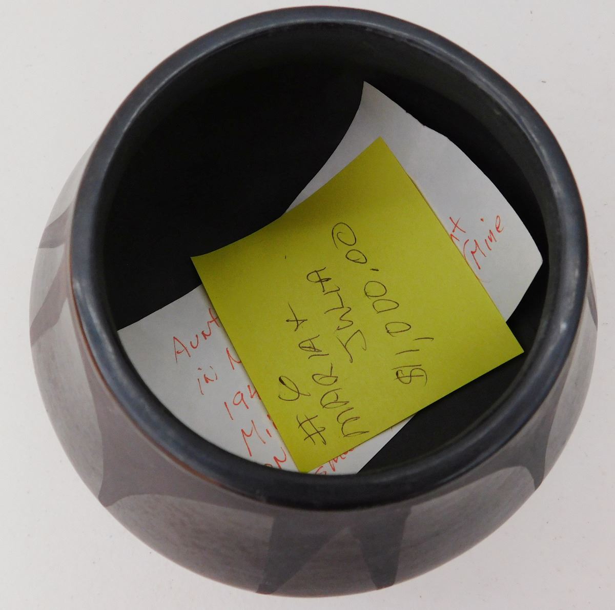 Maria and Julian Olla, circa 1948. Made of clay and paint, this item measures 6 x 4 1/2 inches. This rare pot is signed by Maria and Julian on the bottom. From San Ildefonso, New Mexico. Condition: Good, minor scuffs, see images. Shipping: $40.00 w/insurance.
