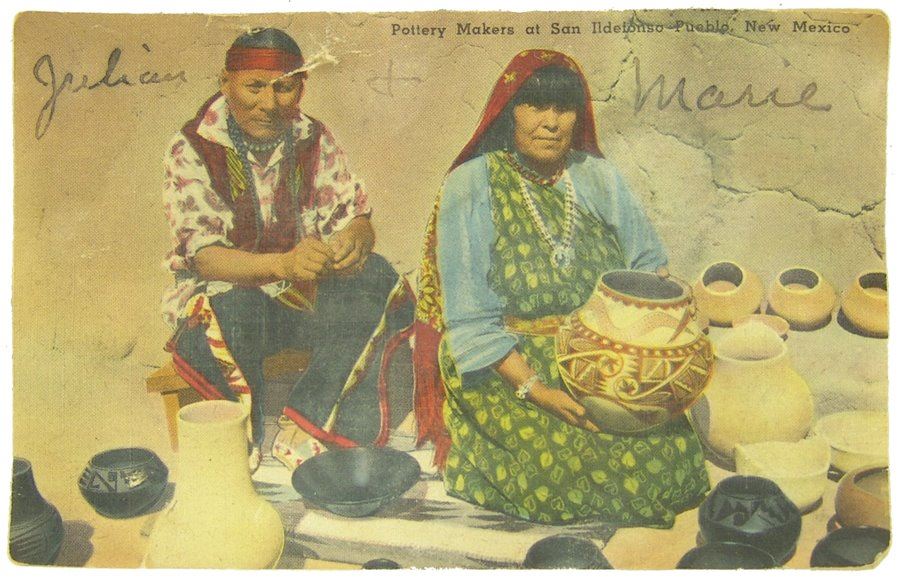 Rare, early postcard "Pottery Makers at San Ildefonso Pueblo, New Mexico" showing Maria and Julian, and signed by both. Fair condition. The front and back have split but both pieces are intact. In protective frame.,,3-1/2" x 5-1/2"