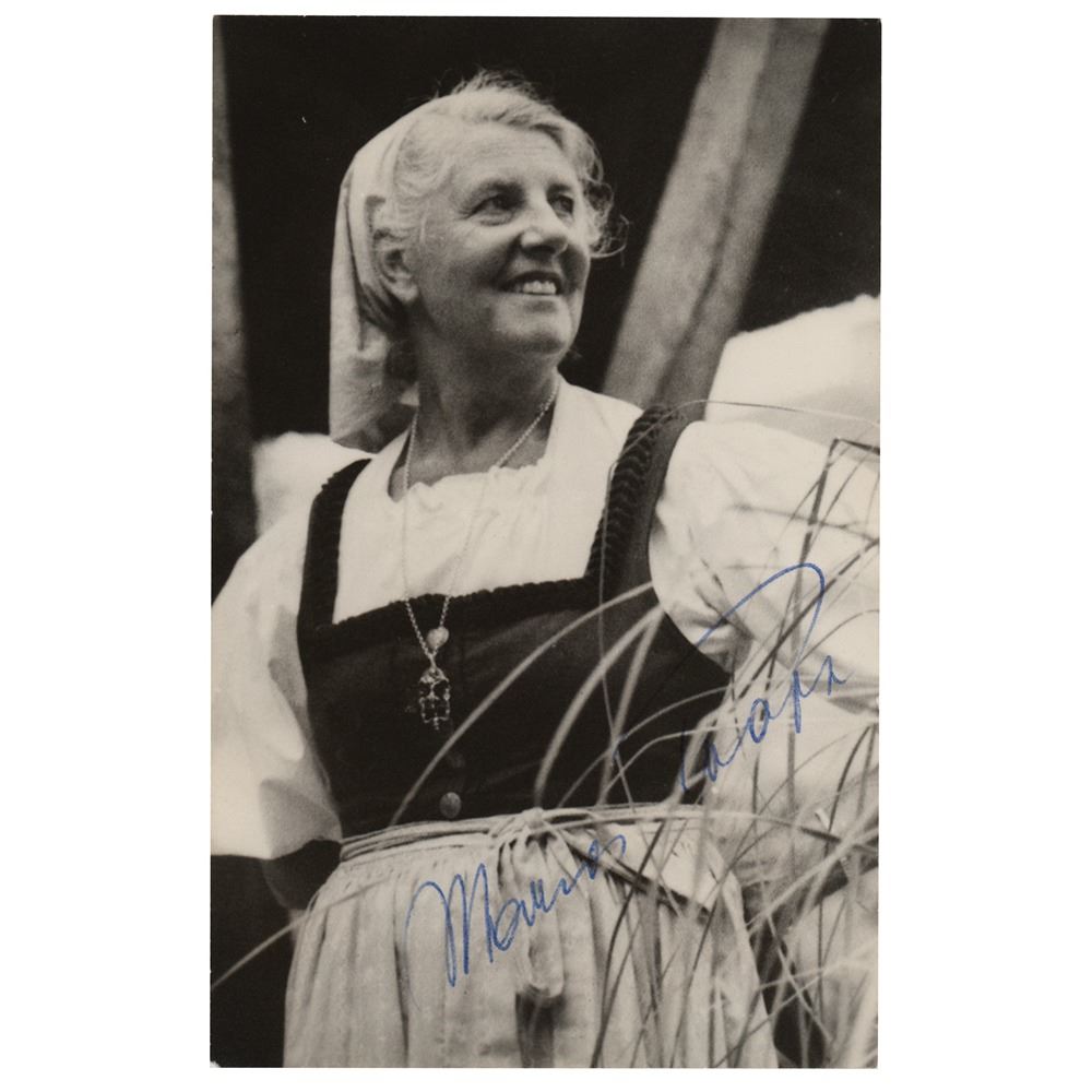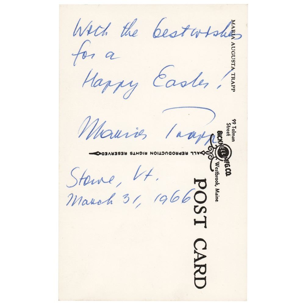Vintage matte-finish 3.5 x 5.5 postcard photo of Maria Von Trapp, signed on the front in blue ballpoint, "Maria Trapp," and on the reverse, "With the best wishes for a Happy Easter, Maria Trapp, Stowe, Vt., March 31, 1966." In fine condition.