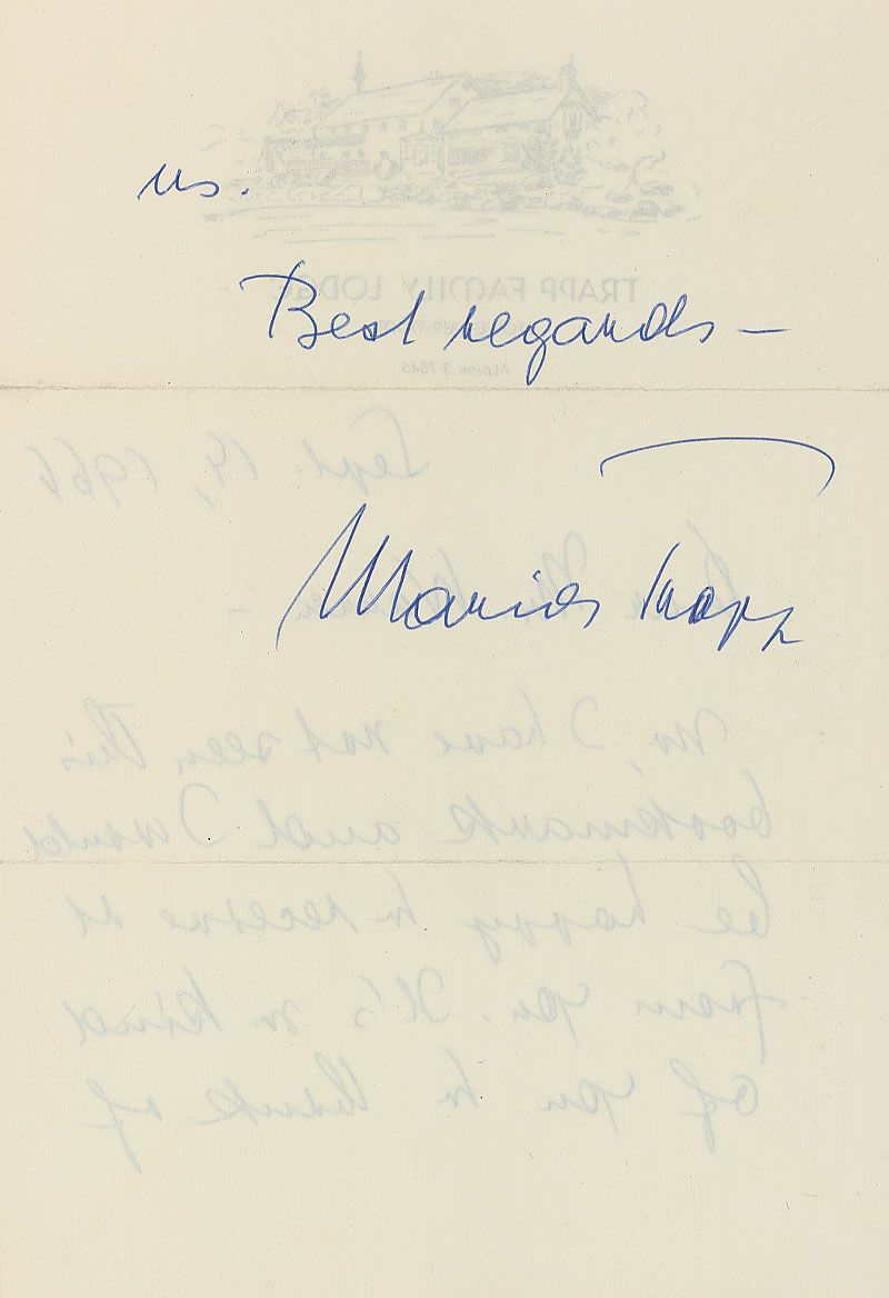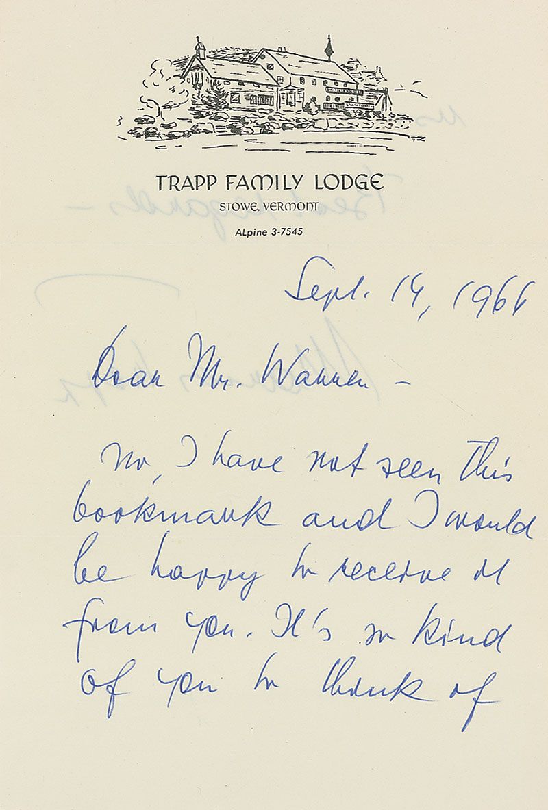 ALS, one page both sides, 6 x 9, Trapp Family Lodge letterhead, September 14, 1966. Letter to an admirer. In part: “No, I have not seen this bookmark and I would be happy to receive one from you.” In fine condition. Accompanied by the original mailing envelope.
