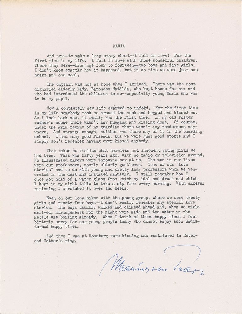 Souvenir typescript, one page, 8.5 x 11, signed at the conclusion in blue ballpoint, "Maria von Trapp." An excerpt entitled "Maria," in part: "The captain was not at home when I arrived. There was the most dignified elderly lady, Baroness Matilda, who kept house for him and who had introduced the children to me—especially young Maria who was to be my pupil." In fine condition.