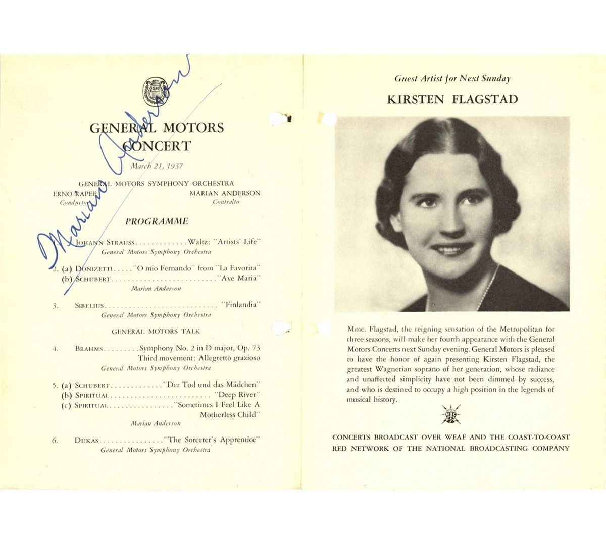 Nice signed program from the General Motors Orchestra 3/21/1937. program in fine condition although does have binder holes in middle margin. Marian Anderson was an African-American contralto and one of the most celebrated singers of the twentieth century. She preferred to perform in concert and recital only, even though she had many offers to perform as an actress. Anderson became an important figure in the struggle for black artists to overcome racial prejudice in the United States during the mid-twentieth century
