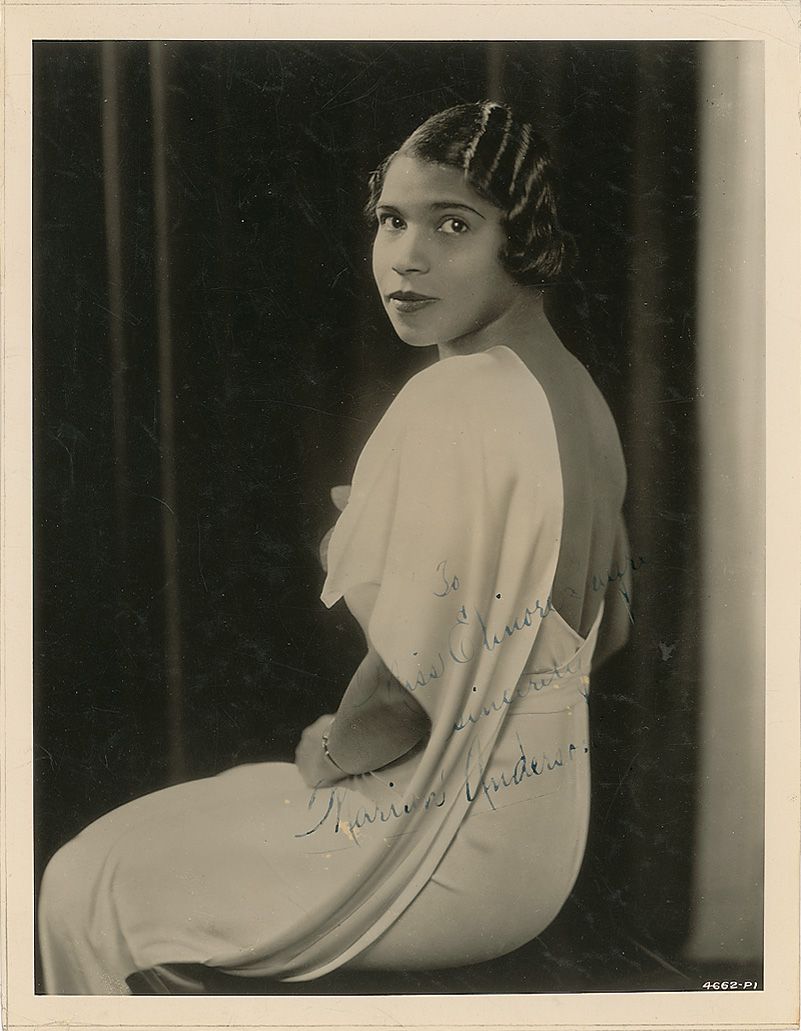 Vintage glossy 7.5 x 9.75 photo of a seated Anderson, signed and inscribed in fountain pen “To Miss Elinore Sayre, Sincerely, Marian Anderson.” In very good condition, with a light but legible inscription and signature, scattered creases, and trimmed edges.
