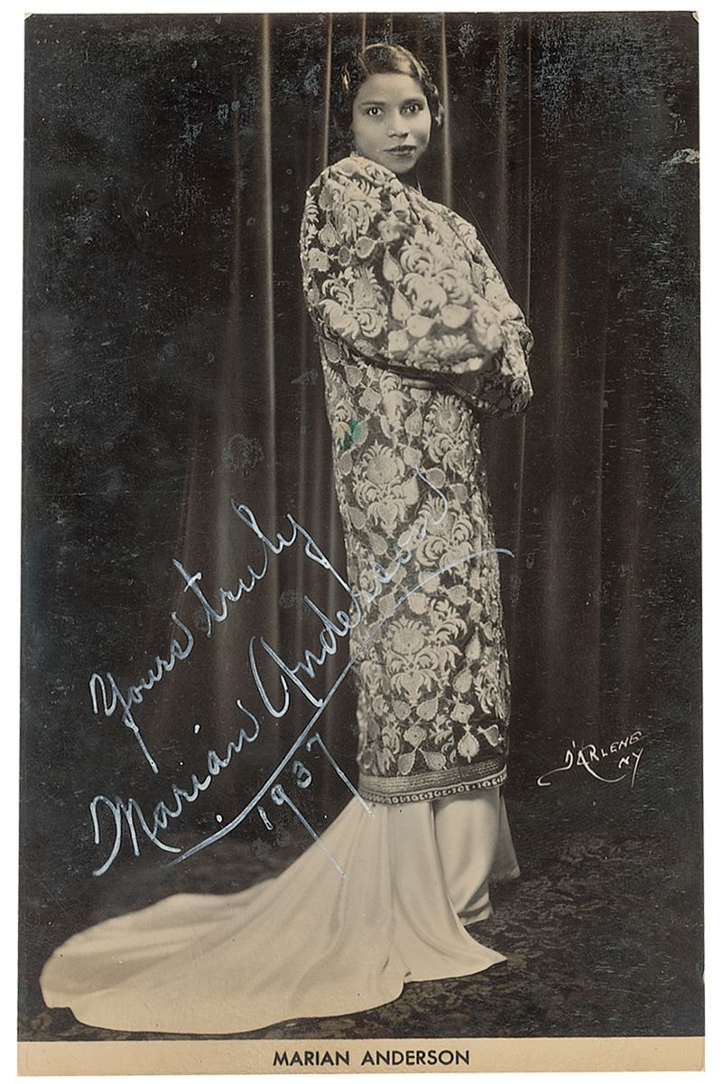 Vintage glossy 3.5 x 5.25 postcard photo of Anderson in costume, signed in white ink, “Yours truly, Marian Anderson 1937.” In very good condition, with silvering to edges, scattered rubbing and surface marks to finish, and a few fingerprints.