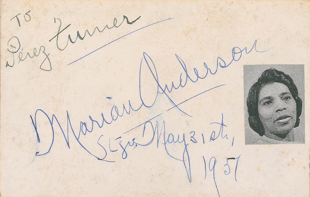 Vintage 3.5 x 5.5 photo postcard of a Chilean seashore, signed on the reverse in ballpoint, “Marian Anderson Stgo., May 31st, 1951,” with a small clipped photo affixed to right edge, and an inscription at the top added in another hand. Scattered light toning and foxing, otherwise fine condition.