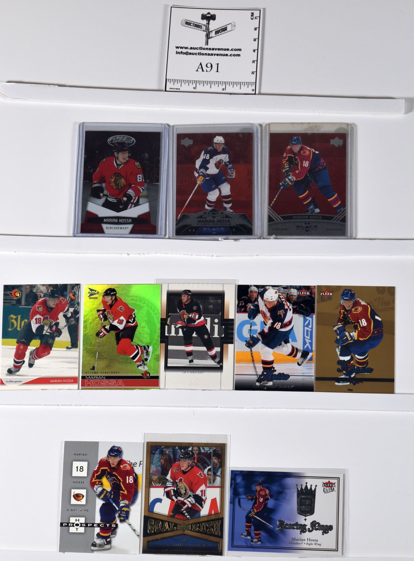 11 Marian Hossa Cards including 10-11 Certified 552/999, 06-07 Double Black Diamond Ruby 060/100, 07-08 Triple Black Diamond Ruby 003/100