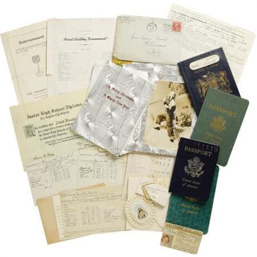 <B>Marian Marsh Personal Items.</B></I> This assortment of Marian Marsh's belongings includes her signed passports from 1933, 1960, 1972, and 1977, the L.A. City School System Division of Attendance and Employment of Minors form that allowed her (as a minor) to star in <I>Svengali,</B></I> her junior high school diploma and report cards, birthday and Christmas greetings from her "Pop," a religious marker, four Christmas cards circa 1935 with a photograph inside of Marian in snow with skis, a hostile piece of 1932 mail from a "fan" angry at Marian for relating in an interview that her native Trinidad had dangerous alligators and boa constrictors (the fan was born in Trinidad too), her late 1970s California driver's license, a junior high school program and a preview credit list from the 1939 film <I>Arrest Bulldogg Drummond</B></I> (in which Marian's sister Jean Fenwick played a villainess). All are in Excellent condition. <I>From the Marian Marsh Archive</B></I>.<BR><BR><b>Shipping:</b> Books & Catalogs (<a target="_blank" href="http://www.heritageauctions.com/common/shipping.php">view shipping information</a>)