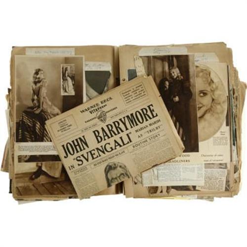 <B>Marian Marsh Personal Scrapbook.</B></I> This was Marian Marsh's personal scrapbook, tracing her rise (and eventual eclipse) as a major movie star. The book is bulging with material (literally layers of clippings per page) beginning in 1930, with her appearance in the play <I>Young Sinners,</B></I> to the Christmas Eve announcement of her winning the role of Trilby in John Barrymore's <I>Svengali,</B></I> followed by voluminous 1931 clippings on <I>Svengali,</B></I> magazine and newspaper ads, reviews, and a 14-page newspaper published by Warner Bros. and devoted to the film, as well as <I>Five Star Final</B></I> and <I>The Mad Genius,</B></I> coverage of her selection as a 1931 "Wampas Baby Star"; color covers of Marian from <I>Modern Screen,</B></I> <I>Screen Book,</B></I> <I>Silver Screen</B></I> and more. The scrapbook contains about 50 pages, measures approximately 11" x 15" and survives not only as colorful testimony to Marian's most palmy days of stardom, but also a documentation of her career decline. The clippings (many over 75 year sold) are brittle here and there, but intact, with terrific material on every page, and are in overall Very Good condition. A genuine treasure-trove of Golden Age cinema pictures, stories and promotion, kept by the lady who experienced it all. <I>From the Marian Marsh Archive.</B></I><BR><BR><b>Shipping:</b> Books & Catalogs (<a target="_blank" href="http://www.heritageauctions.com/common/shipping.php">view shipping information</a>)