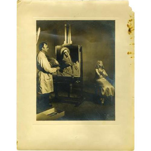 <B>Marian Marsh Madonna-Style Prop Painting from "Svengali."</B></I> "Greatest Star of Today and Greatest Star of Tomorrow in a Drama that Will Live Forever!" proclaimed Warner Bros. as it premiered <I>Svengali</B></I> (1931), based on the 1895 George Du Maurier novel. "Today's" greatest star was John Barrymore, giving perhaps his finest screen performance as the sly, sinister and finally heartbreaking Svengali, while "Tomorrow's" greatest star was 17-year old Marian Marsh, who played Trilby, hypnotized by Svengali into becoming both a singing sensation and his reluctant lover. Marian Marsh never fulfilled Warner's lavish promotion, yet her Trilby remains a uniquely fascinating portrayal: an alluring, sympathetic and ultimately tragic horror heroine who, in a climax still startling more than 75 years later, willingly joins her villain in death. The painting was created especially for the film, and is a beautiful portrait in the style of a Raphaelite Madonna, with halo, religiously iconic and designed to represent the spiritual essence that the hero, the artist "Little Billee" (Bramwell Fletcher), saw in Trilby. The painting appears in the film, the lower area sketched but not painted; it was eventually completed and refined, and Warner Bros. gave it to Marian, who proudly displayed the painting in her home in Palm Desert, where it hung until her death in 2006. The painting measures 28" x 36" inside an impressive 34" x 42" off-white frame with gold streaking. The portrait also comes with an 11" x 14" Warner Bros. publicity display with a 7.5" x 9.5" inset picture of the artist (unidentified) painting this portrait as Marian poses for it. (This display has some damage on the right border, none touching the photo.) This is an exquisite artifact from one of Hollywood's great Golden Age melodramas, as well a very impressive piece of artwork in its own right, and a rather touching memento that reminded a long-retired actress of her past fame. <I>From the Marian Marsh Archive.</B></I><BR><BR><b>Shipping:</b> Framed - without Glass, Large (<a target="_blank" href="http://www.heritageauctions.com/common/shipping.php">view shipping information</a>)