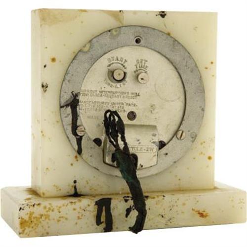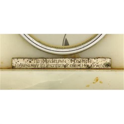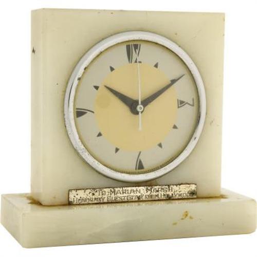 <B>Marian Marsh's Art Deco Clock.</B></I> A white marble Whitehall-Hammond synchronous movement clock from the early '30s, with a plaque affixed to the base inscribed: "To Marian Marsh Honorary Guest Star Hollywood." Though the power cord has been damaged, the clock is in Good condition, with cracks and a few chips to the back and base. <I>From the Marian Marsh Archive</B></I>.<BR><BR><b>Shipping:</b> Flat Material, Small (<a target="_blank" href="http://www.heritageauctions.com/common/shipping.php">view shipping information</a>)