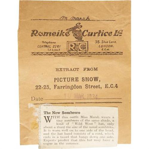 <B>Marian Marsh's Bolero Hat.</B></I> A black bolero-style hat with intricate gold beadwork along the rim and two large gold tassels on the cord. Marsh sported this hat in 1934 and started a fashion trend, as an included newspaper clipping attests. The clipping mentions this particular hat and how others might copy her stylish look. In Very Fine condition with a few small tears to sash. <I>From the Marian Marsh Archive.</B></I><BR><BR><b>Shipping:</b> Clothing, Costumes & Jerseys (<a target="_blank" href="http://www.heritageauctions.com/common/shipping.php">view shipping information</a>)