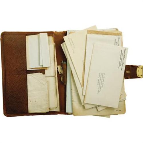 <B>Marian Marsh's Personalized Leather Portfolio from 1934.</B></I> The tan leather portfolio, embossed with Marsh's name in the upper left corner, was last used during her travels abroad in 1934. Included inside are multiple letters of introduction to Marsh addressed to various hotel managers across Europe, as well as an introductory letter addressed to Michael Balcon, head of Ealing Studios, from director Harry Lachman. A partial, annotated script for Marsh's 1934 German film <I>Der Verlorene Sohn</B></I> (<I>The Prodigal Son</B></I>) has been stored inside; this trip to Europe must have concluded with the film's production in Germany, as it was released later that year. Also included are multiple handwritten notes and the Cunard sailing list for 1934. The notebook's clasp is in working condition, with the keys still attached inside, and the leather has moderate wear along spine with minor seam splits along lower cover. In overall Very Good condition. <I>From the Marian Marsh Archive</B></I>. <I>Accompanied by LOA from PSA/DNA.</B></I><BR><BR><b>Shipping:</b> Books & Catalogs (<a target="_blank" href="http://www.heritageauctions.com/common/shipping.php">view shipping information</a>)