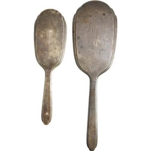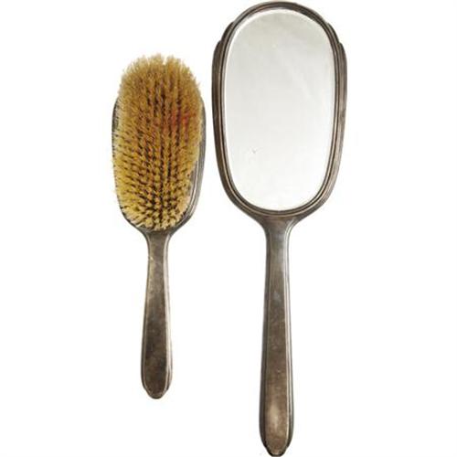 <B>Marian Marsh's Silver Hand Mirror and Brush with her Engraved Initials.</B></I> Beautiful silver hand mirror and silver brush, engraved "MM." The silver is somewhat tarnished but still impressive, and must have been in Marian's possession for many years. Lovely keepsakes from the vanity table of a 1930s Hollywood beauty. <I>From the Marian Marsh Archive</B></I><BR><BR><b>Shipping:</b> Clothing, Costumes & Jerseys (<a target="_blank" href="http://www.heritageauctions.com/common/shipping.php">view shipping information</a>)