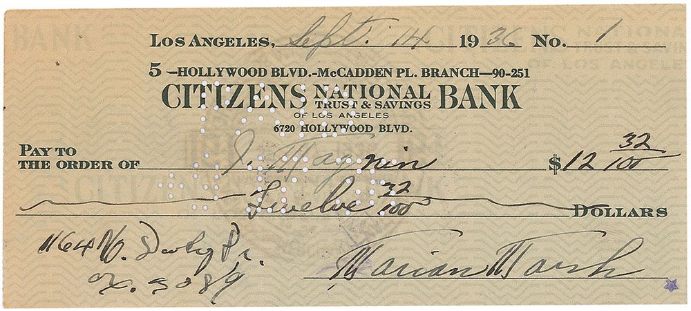 Actress (1913–2006) who appeared in Crime and Punishment with Peter Lorre, and The Black Room (1935) with Boris Karloff. Bank check, 6.25 x 2.75, filled out and signed by Marsh, payable to J. Magnin for $12.32, September 14, 1936. In very good condition, with several vertical creases, two passing through single letters of signature, cancellation holes to body, staple holes to top left, and scattered toning.