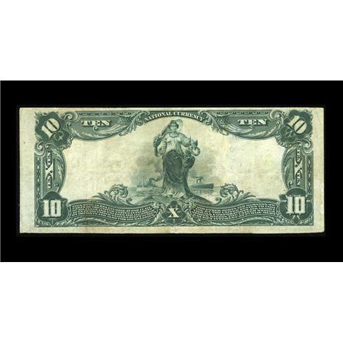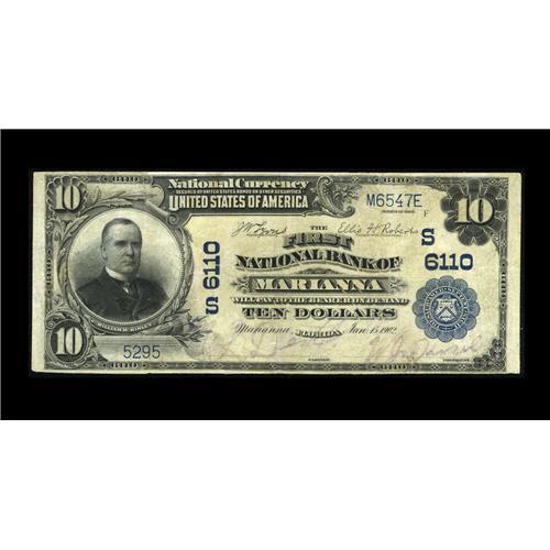 <B>Marianna, FL</B></I> - $10 1902 Plain Back Fr. 624 <B>The First NB</B></I> Ch. # (S)6110<BR>There were just 7 large in the census until this <B>Very Fine</B></I> $10 crossed our desk. It has purple stamped signatures and original surfaces. There is just a hint of soiling noticed, but it is not distracting. The note has a January 15, 1902 engraved plate date as this bank also issued the so-called 1922 Fourth Charter notes.<BR><BR><b>Shipping:</b> Coin/Currency (<a target="_blank" href="http://www.heritageauctions.com/common/shipping.php">view shipping information</a>)