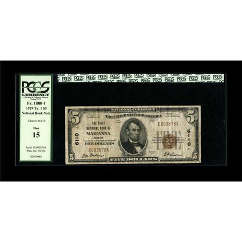 <B>Marianna, FL</B></I> - $5 1929 Ty. 1 <B>The First NB</B></I> Ch. # 6110<BR> From our 2006 FUN auction where the description read, "A scarce note from the only bank to issue in this small panhandle community. It has been graded <B>Fine 15</B></I> by PCGS and appears utterly defect free through the PCGS encasement."<BR><I>From The Amelia Island Collection.</B></I><BR><BR><b>Shipping:</b> Coins & Currency (<a target="_blank" href="http://www.heritageauctions.com/common/shipping.php">view shipping information</a>)