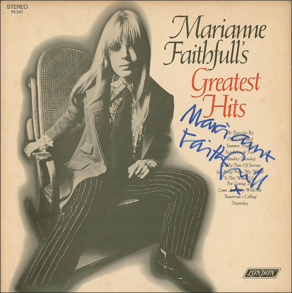Marianne Faithfull’s Greatest Hits album signed in blue felt tip, “Marianne Faithfull.” Few creases, edge soiling, scattered staining, and some edge wear, otherwise fine condition. The record is not included.