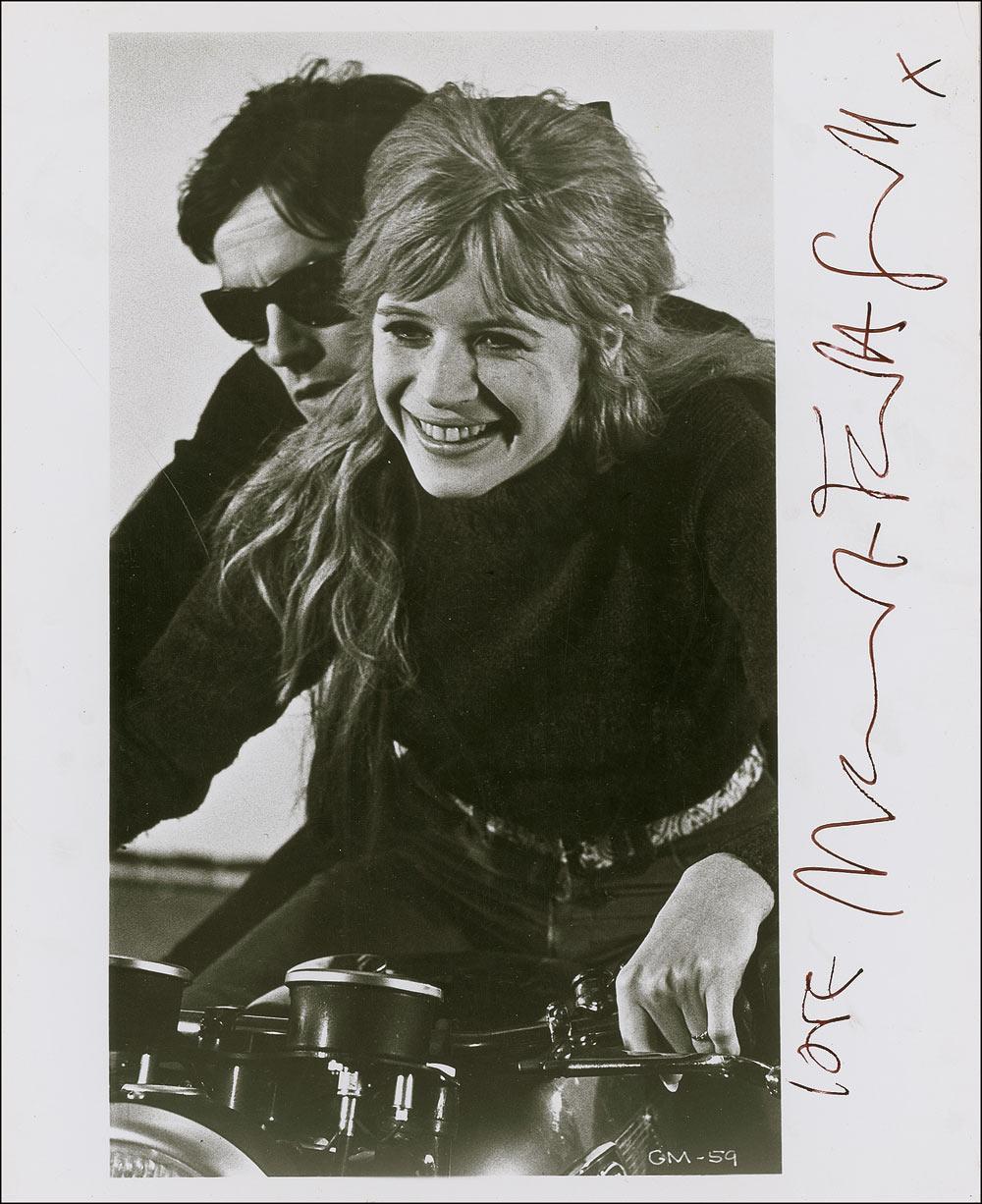 Glossy 8 x 10 cardstock photo of Faithfull sharing a motorcycle with a man, signed vertically in black ink. In fine condition, with a bit of light streaking to emulsion, and a bit of irregular ink adhesion to signature.
