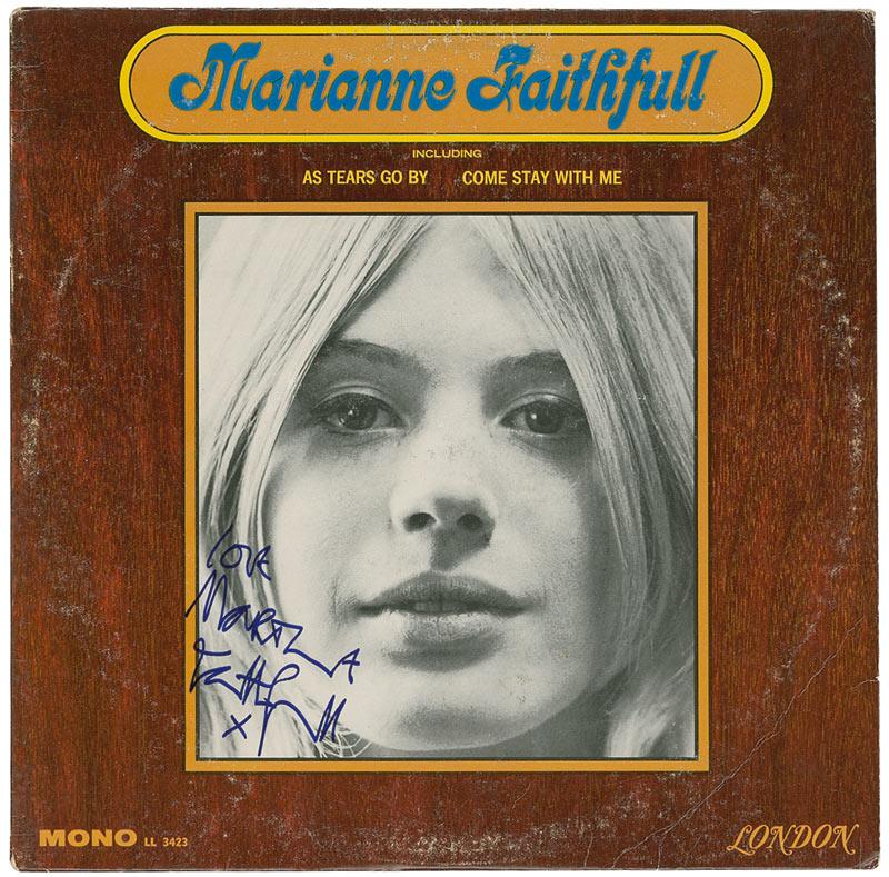 Marianne Faithfull album signed on the front in blue felt tip. In very good condition, with crease to the lower right corner on the front, wear to the edges and corners, and ‘ring of wear’ on the front and back. The record is not included.