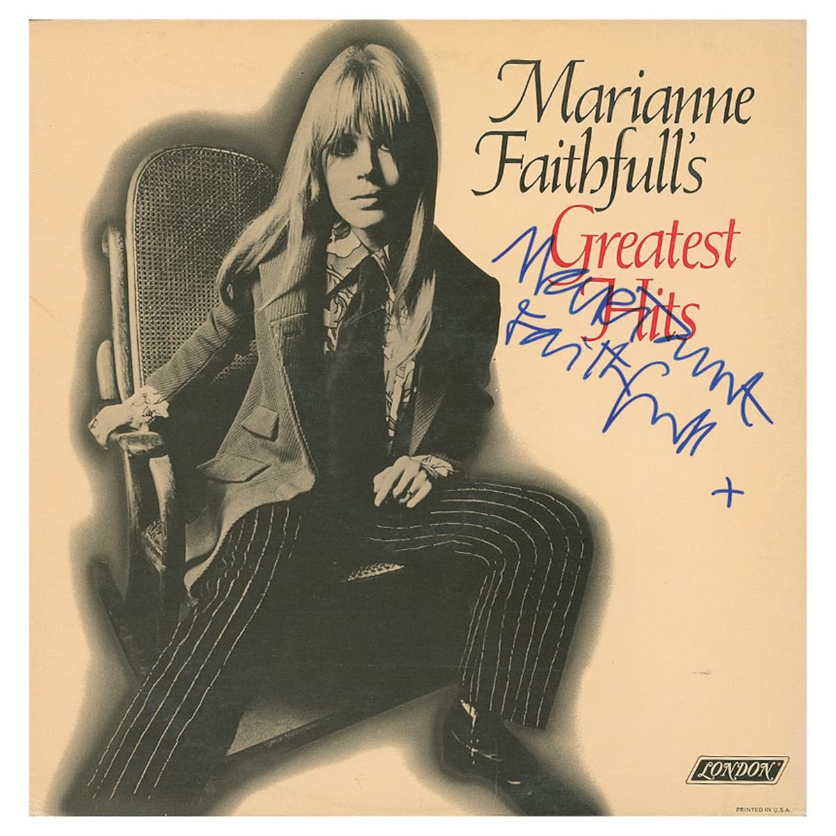 Marianne Faithfull’s Greatest Hits album signed on the front cover in blue felt tip “Marianne Faithfull x.” In fine condition, with light ‘ring of wear’ and scattered creases. The record is not included.