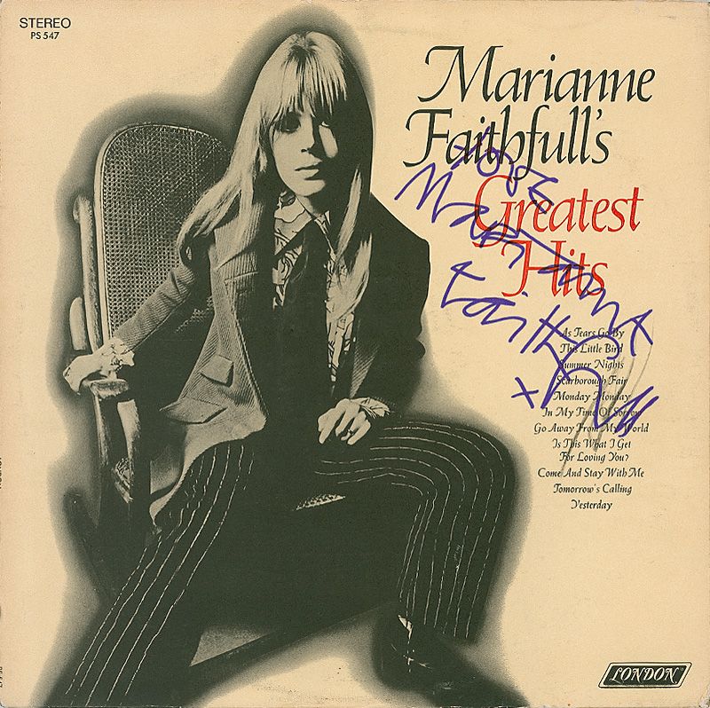 Marianne Faithfull’s Greatest Hits album signed on the front cover in blue felt tip, “Love, Marianne Faithfull x.” In fine condition, with some scattered light cover wear and a few corner bumps. The record is not included.