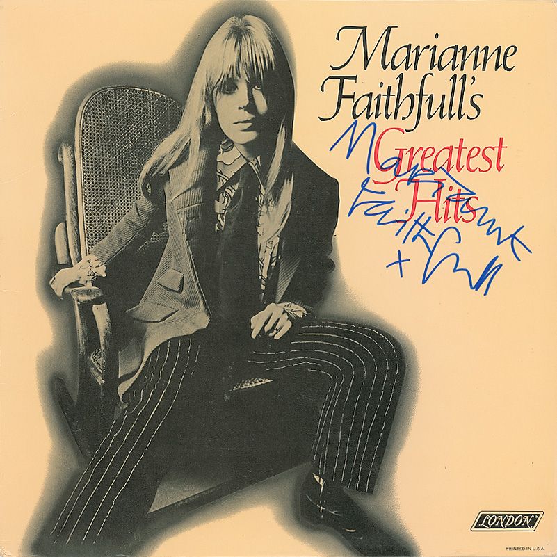 Marianne Faithfull’s Greatest Hits album signed on the front cover in blue felt tip, “Marianne Faithfull X.” In fine condition, with a few light creases. The record is not included.