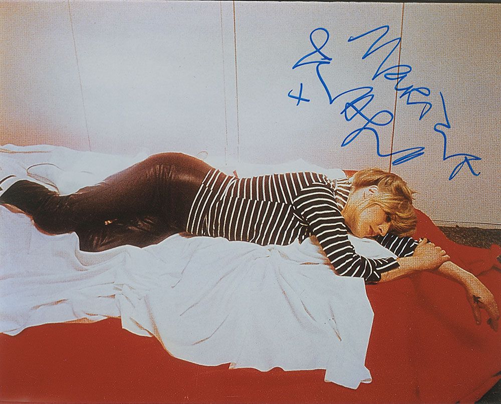 Color satin-finish 10 x 8 photo of Faithfull lying on a bed, signed in blue felt tip. In very fine condition.