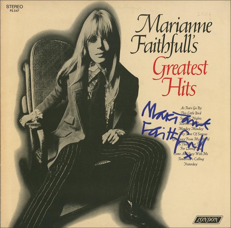 Marianne Faithfull’s Greatest Hits album signed on the front cover in blue felt tip. In fine condition, with a mild ‘ring of wear’ to cover. The record is included.