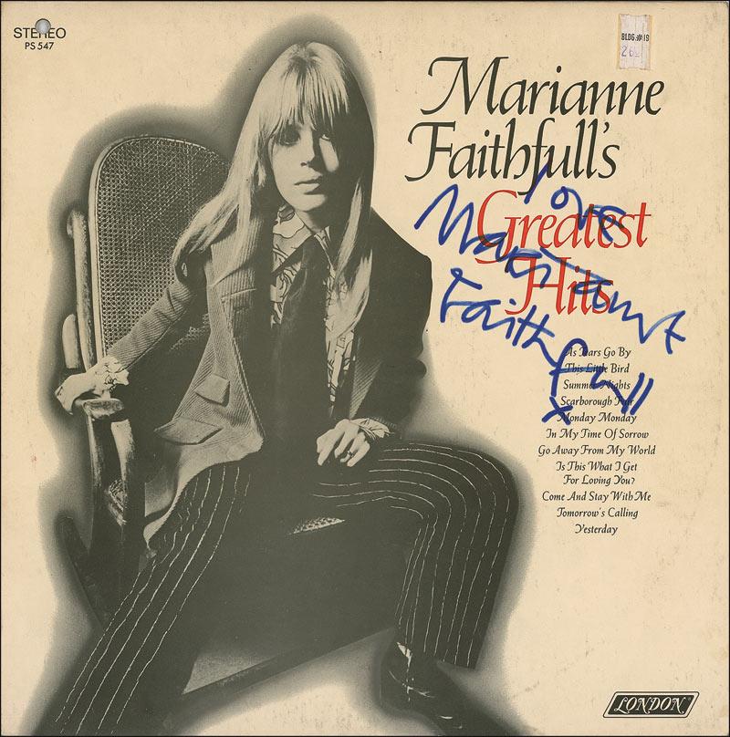 Marianne Faithfull’s Greatest Hits album signed on the front cover in blue felt tip. Punch hole to top left, price label to top right, and scattered light surface rubbing and wear, otherwise fine condition. The record is not included.
