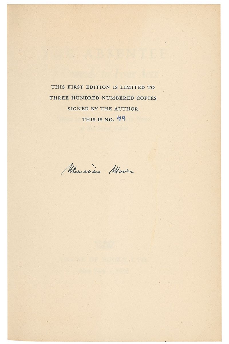 Signed book: The Absentee. Limited edition of 300 copies (this being No. 49). NY: House of Books, Ltd., 1962. Hardcover, 5.25 x 7.5, 88 pages. Signed on the colophon in black ink. In fine condition, with some mild sunning to spine.