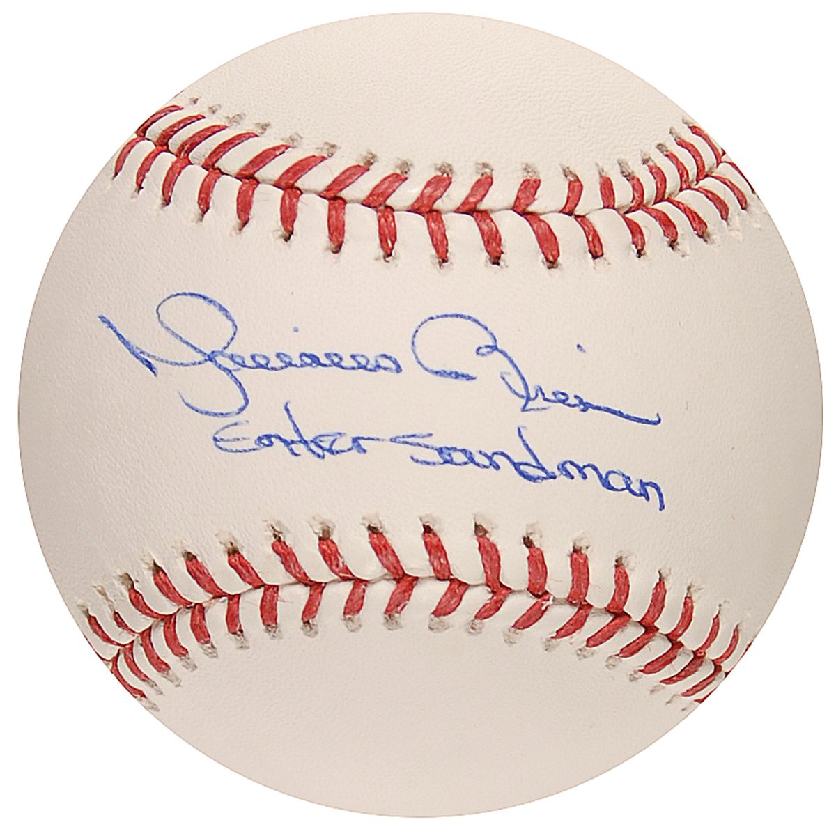 Official Rawlings Major League baseball signed in blue ballpoint on the sweet spot, “Mariano Rivera, Enter Sandman.” In very fine condition.