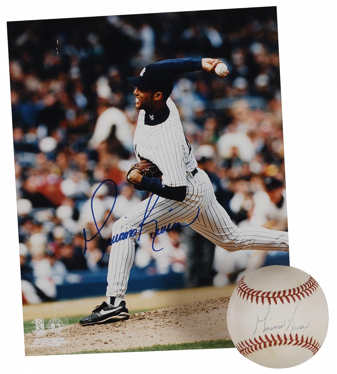 Two items: color glossy 8 x 10 photo of Rivera on the mound, signed in blue felt tip; and an official Rawlings American League baseball, signed on the sweet spot in blue ballpoint. In fine condition, with a bit of scattered light toning to ball.
