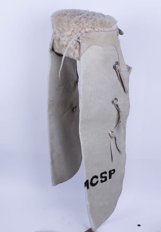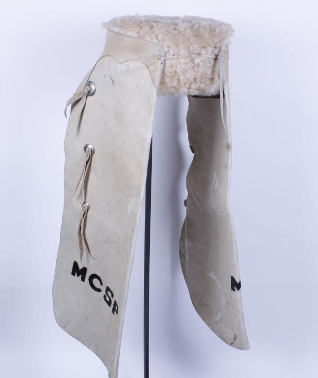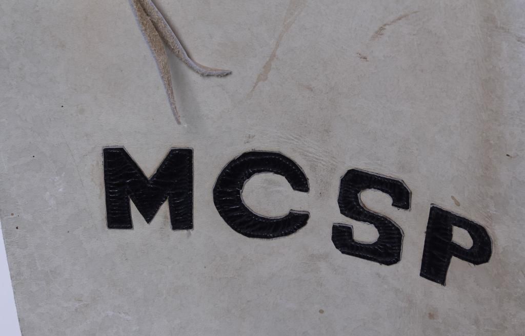 White leather with black lettering "MCSP", nickel conchos with stars, shows wear.