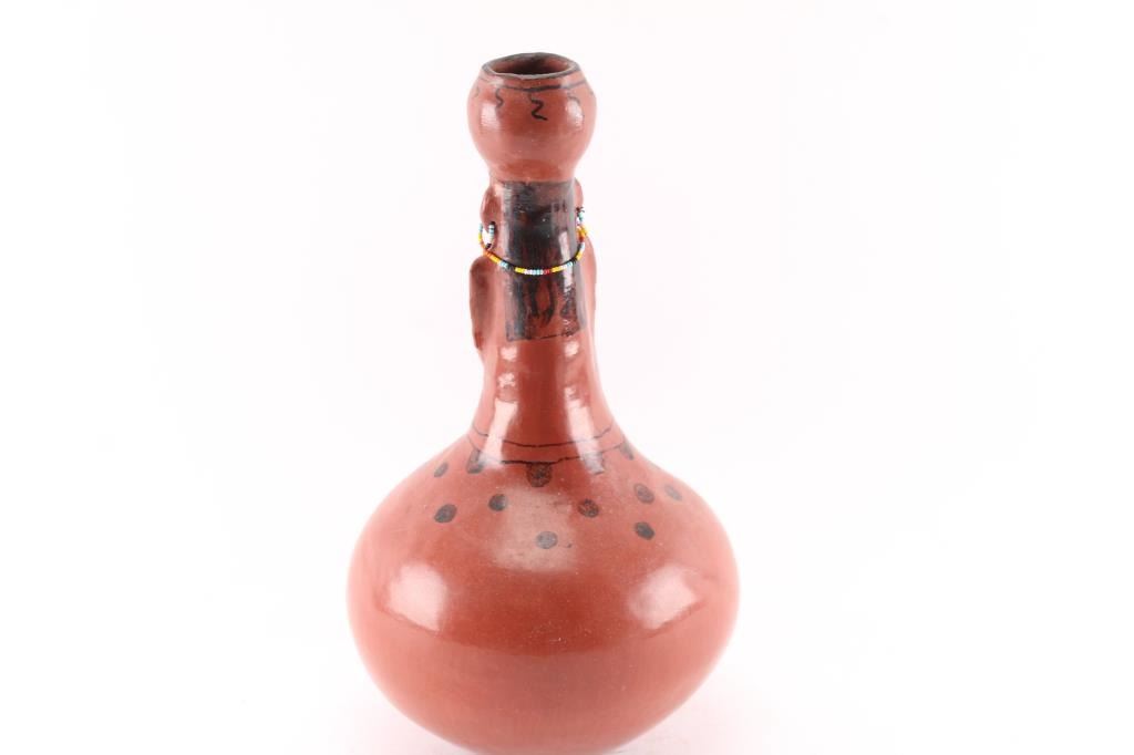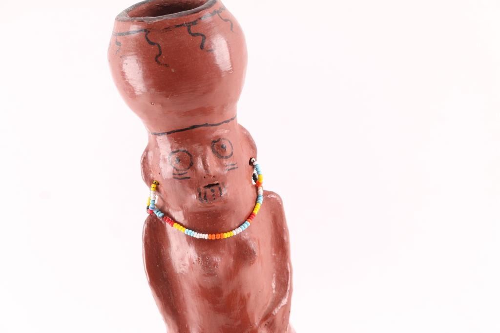 Redware pot shaped like woman with pottery hat, accented with beaded earrings and necklace and a painted black polychrome finish. 15" tall by 9" diameter. In very good to excellent condition. From the Steve Goldstein Collection, Scottsdale, AZ.