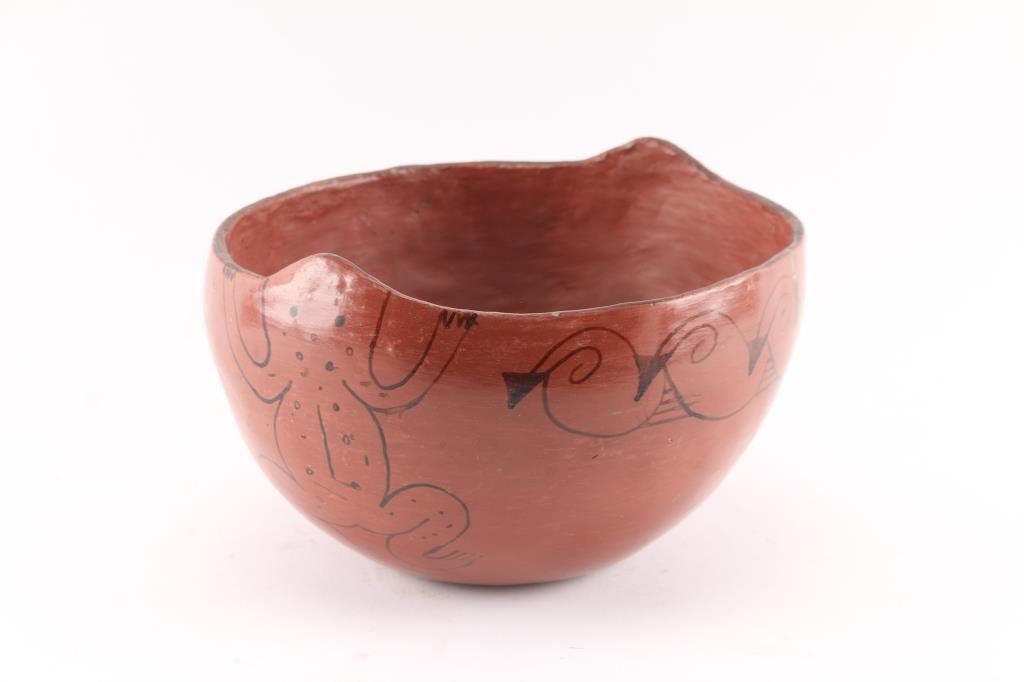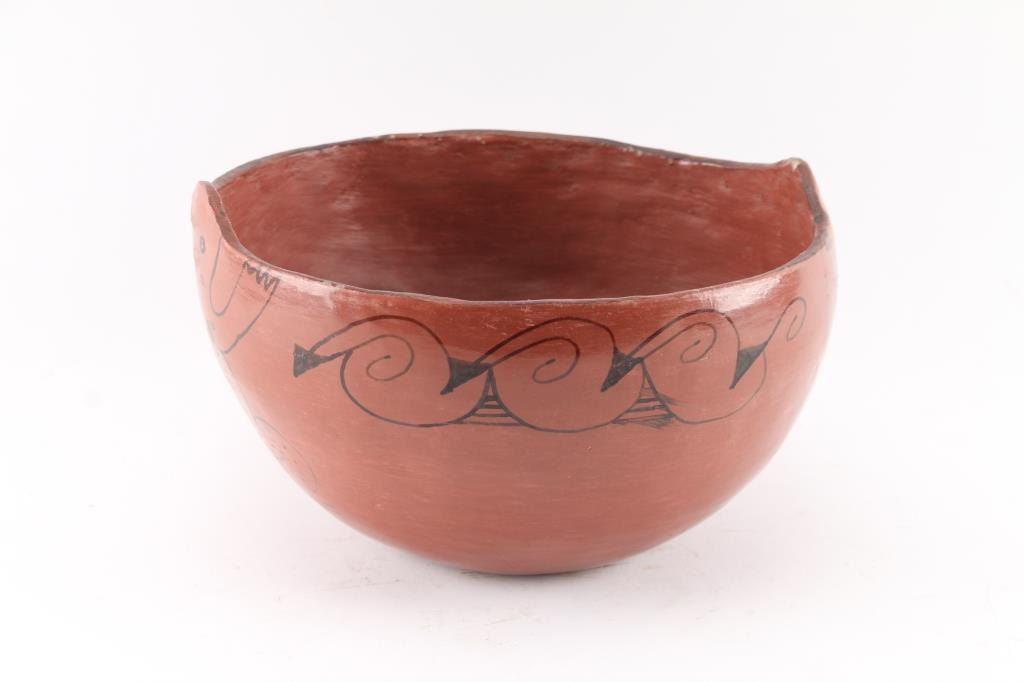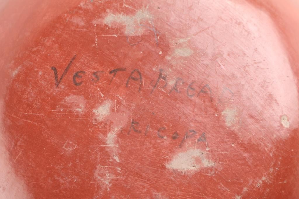 Redware polychrome pot with black geometric design. Signed on base, Vesta Bread. 9" wide by 5" tall. Condition shows age, tiny losses to rim. Otherwise perfect. From the Steve Goldstein Collection, Scottsdale, AZ.