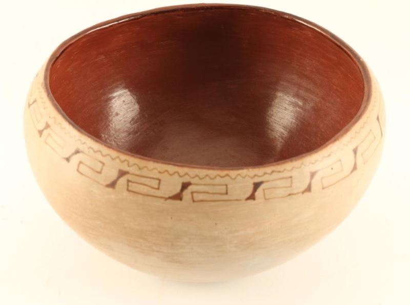 Light brown with terracotta interior signed Barbara Johnson on base. Measures 8"x5". In excellent condition. Barbara Johnson (c. 1925-2004) was a member of the Maricopa Tribe but is known for making pottery of the Mojave style, particularly effigy vessels such as this double-headed one embellished with beaded earrings and necklace. Maricopa pottery making essentially was non-existent at the turn of the 20th century.