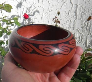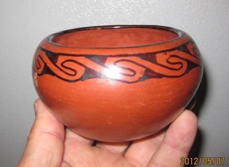 Arizona Maricopa Pottery Vessel Black on red paint - Circa 1950's. Measures 4x3 inches. Good Condition. Measures 4 x 3 iches. Shipping $12.50